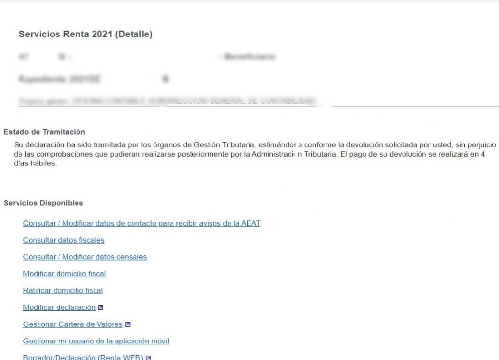 - Luego, en función de la situación de tu tramite, podrás ver en el apartado “Estado de Tramitación” alguno de estos mensajes: “Su declaración se está tramitando”, “Su declaración es siendo comprobada” o “Su declaración ha sido tramitada por los órganos de Gestión Tributaria, estimándose conforme la devolución solicitada por usted, sin perjuicio de las comprobaciones que pudieran realizarse posteriormente por la Administración Tributaria. El pago de su devolución se realizará en XX días hábiles.”